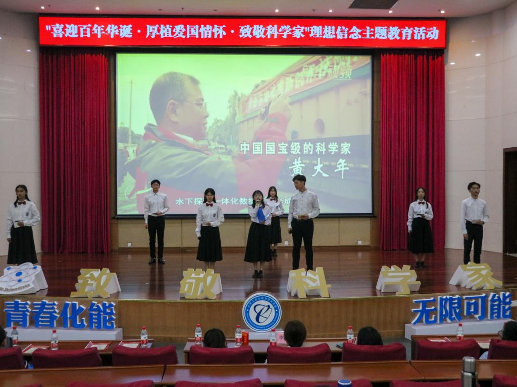 “一件件大国重器的成功研制,撑起了中华民族伟大复兴的坚强脊梁!”罗舒雯、叶小亚、陈子豪等八名学生代表表演了朗诵节目《干惊天动地事、做隐姓埋名人》。一句句慷慨激昂的朗诵词,道出我们万千学子对科学家的敬仰之意!