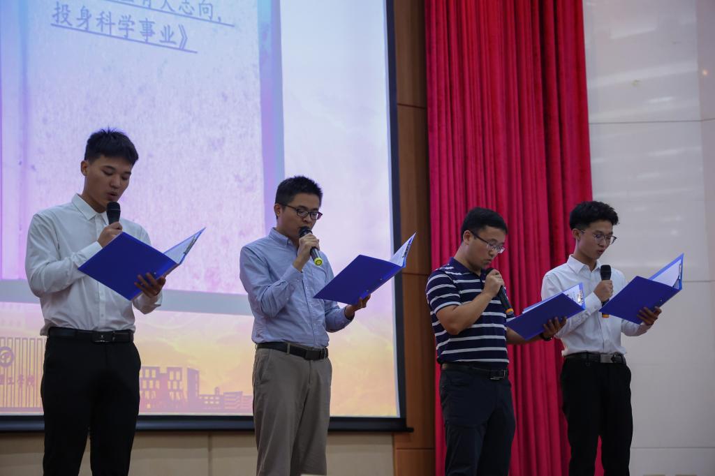 莞工的莘莘学子刻苦学习,志于追求卓越。化能学院优秀班主任代表何运兵博士、刘鉴博士以及今年获得国家奖学金的学生代表李世德和罗彬辉,师生四人诵读了科学经典文章《朱道本:青年人应有大志向,投身科学事业(节选)》。他们分享了学习和参赛的经验,朗诵了我国著名的有机化学、物理化学家,中国科学院院士朱道本的文章,表达了老一辈科学家对青年的期望,展现出一份青年人应有的爱国主义精神与责任担当。