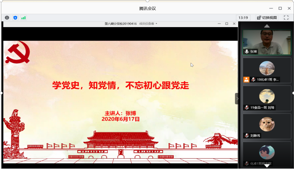 2020年6月17日,化能学院应化与食品学生支部书记张博通过腾讯会议形式为支部党员和入党积极分子讲授“学党史,知党情,不忘初心跟党走”主题党课。