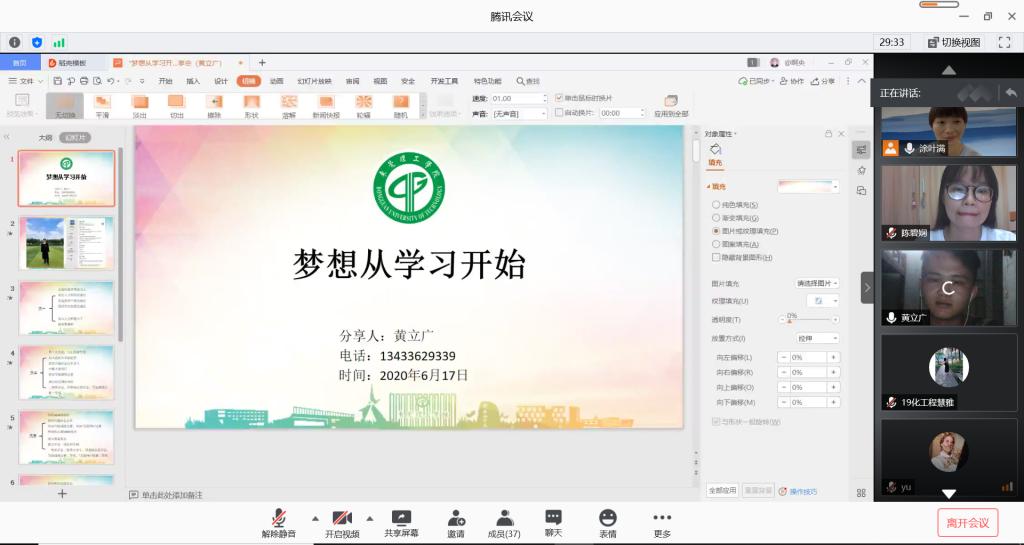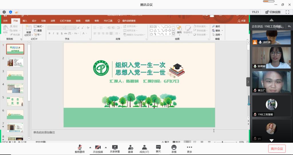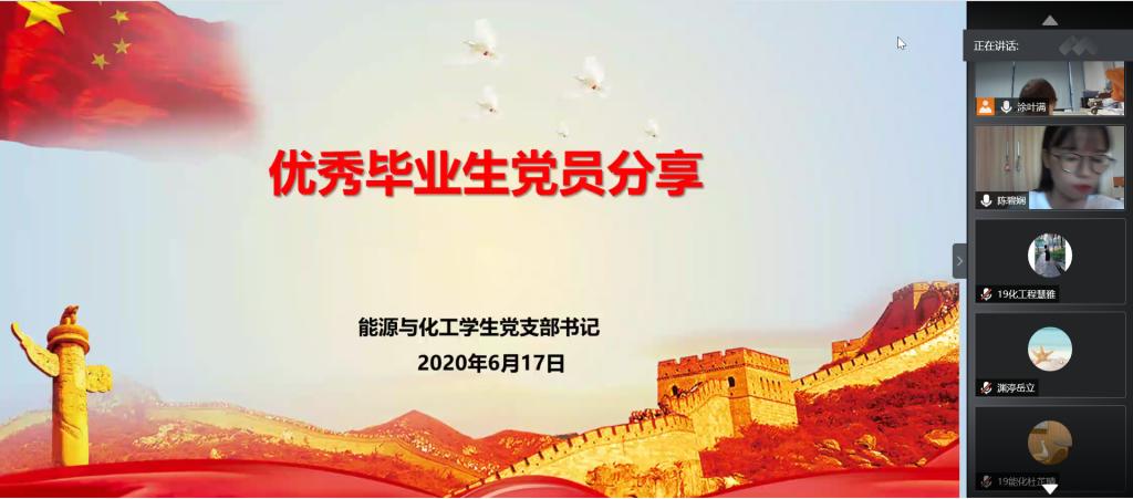 6月17日,化能学院能源与化工学生党支部在腾讯会议上举行了优秀毕业生党员分享会。会上邀请了2020届优秀毕业生党员陈碧娴及黄立广,为第八期34名入党积极分子分享大学四年的奋斗足迹,会议由党支部书记涂叶满主持。