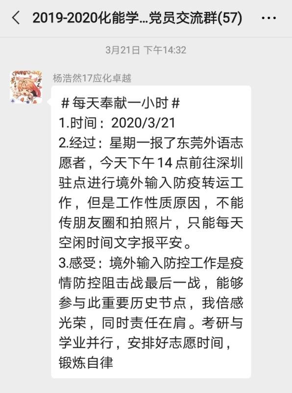 3月16日化能学院学生党支部落实校党委“第一议题”学习制度,组织全体学生党员线上学习习近平总书记关于疫情防控重要讲话和指示批示精神,并认真学习了《高等学校新型冠状病毒肺炎防控指南》的相关内容。通过学习,学生党员对目前全国的疫情防控形势有了更清晰的认识,对防控中的注意事项和科学预防措施有了更深入的了解,更加坚定了战胜疫情的信心,并纷纷表示将从自身做起,坚决为打赢这场疫情防控阻击战贡献青春力量。