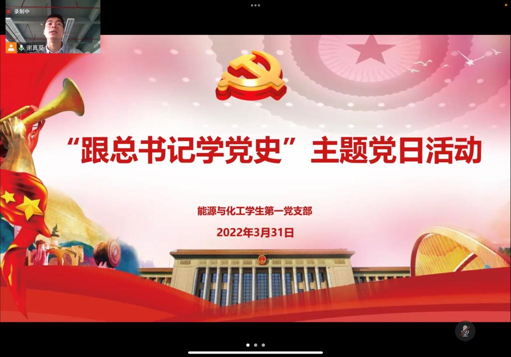 2022年3月31日下午4点30分,化能学院能源与化工学生第一党支部通过线上形式(腾讯会议)开展“跟总书记学党史”主题党日活动,支部全体党员参与了本次主题党日活动。