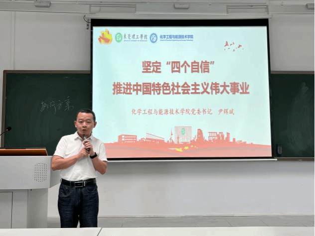 2023年10月16日上午,化能学院党委书记尹辉斌在松山湖校区6D-401教室为2022级能源化学工程、建筑环境与能源应用工程专业的学生讲授“思政第一课”。尹辉斌以《坚定“四个自信”,推进中国特色社会主义伟大事业》为题与在场学生展开交流。