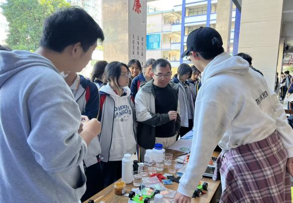 许书瑞老师团队则带来了自主研发的新能源动力小车,以 “看得见的化学能量转化” 引发同学们的强烈好奇。团队详细讲解了小车核心动力源—镁空气电池的绿色工作原理,清晰阐释阴极、阳极的化学反应机制,同时揭秘了基于 “碘钟反应” 的自动化控制系统,让同学们惊叹于化学与智能控制的奇妙联动。
