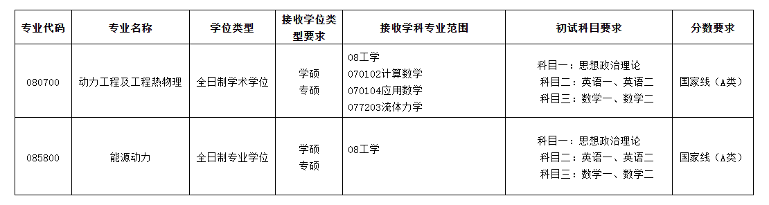 (三) 第一志愿报考专业与本学位点动力工程及工程热物理专业(专业代码:080700)、能源动力专业(专业代码:085800)相同相近,或初试科目与调入专业初试科目相同相近,具体见下表。