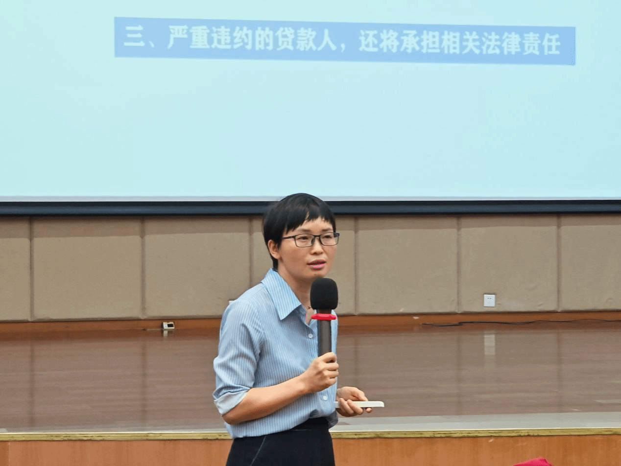 毕业生政治辅导员涂叶满老师向贷款毕业生宣讲征信与诚信知识,增强法律意识,引导其倡导契约精神,叮嘱办理了生源地贷款的毕业生们恪守诚信,及时履行国家助学贷款合同。她提醒同学们要及时登录国家开发银行学生在线系统做好毕业确认、明晰还款计划、提前申请还款的注意事项。