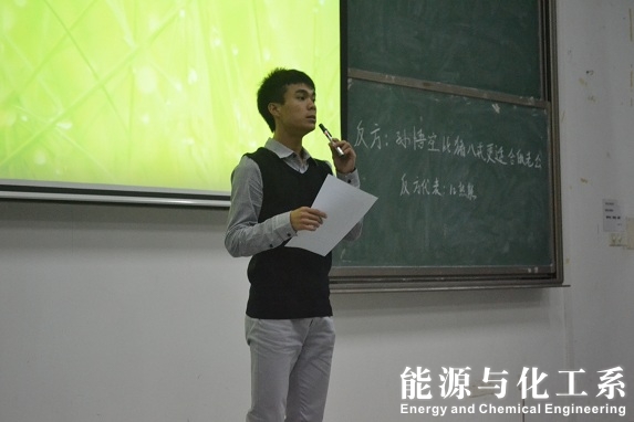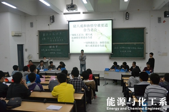 2012年11月18日19:00,在6E306,我能源与化工系迎来了期待已久的辩论赛与心理剧,我们有幸邀请到学院辅导员谢真葵老师、来自机械辩论队的邹建能师兄和凌瑞旺师兄做为本次活动的嘉宾与评委出席,在这激动的时刻,心理剧演员们为了把最好的一面展现给我们,都紧张地预演着,而我们辩论赛的辩友们也在紧张有序地准备着,是啊,他们总是时刻准备着。叮,7点到了,大家安静了下来,因为比赛正式了,首先出场的正反双方进行了简单的自我介绍,便进入了状态,他们自信地陈述着自己的观点,进入攻辩环节与自由环节时是如此的激烈,经过机械学院师兄的意见与建议,辩友们受益匪浅,认识到了自己的许多不足,相信在以后的学习和辩论生涯中会更上一层楼。接下来的正反双方更是激烈,几番唇枪舌剑,时不时引起观众热烈的掌声。