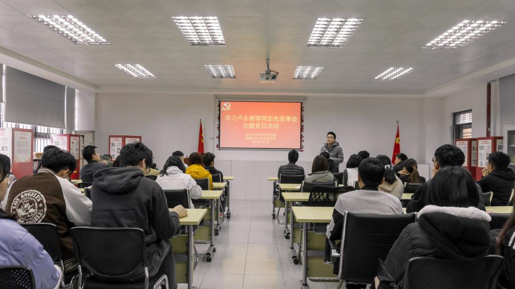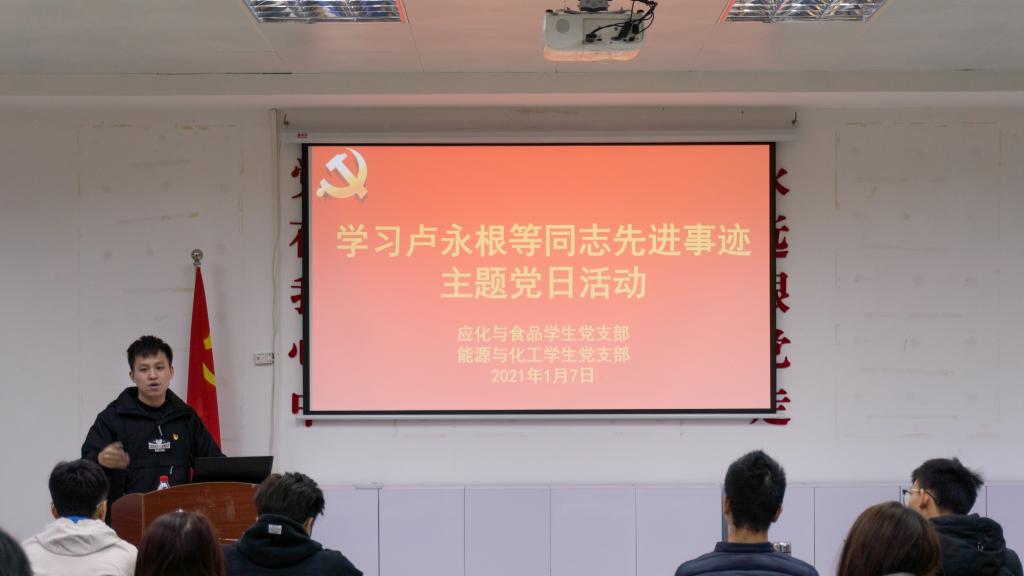 2021年1月7日下午,化能学院应化与食品学生党支部、能源与化工学生党支部联合开展“学习卢永根等同志先进事迹”主题党日活动。辅导员曾祥龙老师和支部党员参加此次活动,活动由应化与食品学生党支部书记张博主持。