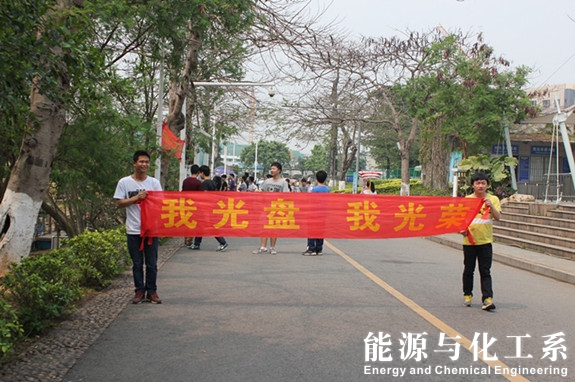 3月20日,能源与化工系13级化学工程与工艺1班全体同学带着印着“我光盘  我光荣”字样的横幅、大头笔等东西,前往松湖烟雨景区进行“光盘”活动的宣传。在活动过程中,志愿者们积极给游客们讲解和展示,使人们更加了解了“光盘”意义,让节约粮食的观念更加深入人心,促进人们养成节约的习惯。