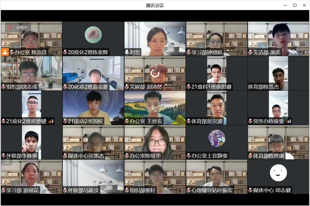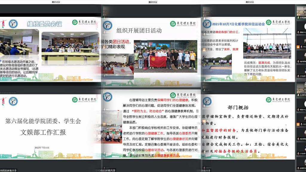 在团委、学生会全体大会上,第六届化能团学各职能部门的11名的学生负责人代表依次进行2021-2022学年的工作总结汇报及工作展望并由学生会委员会进行评议。