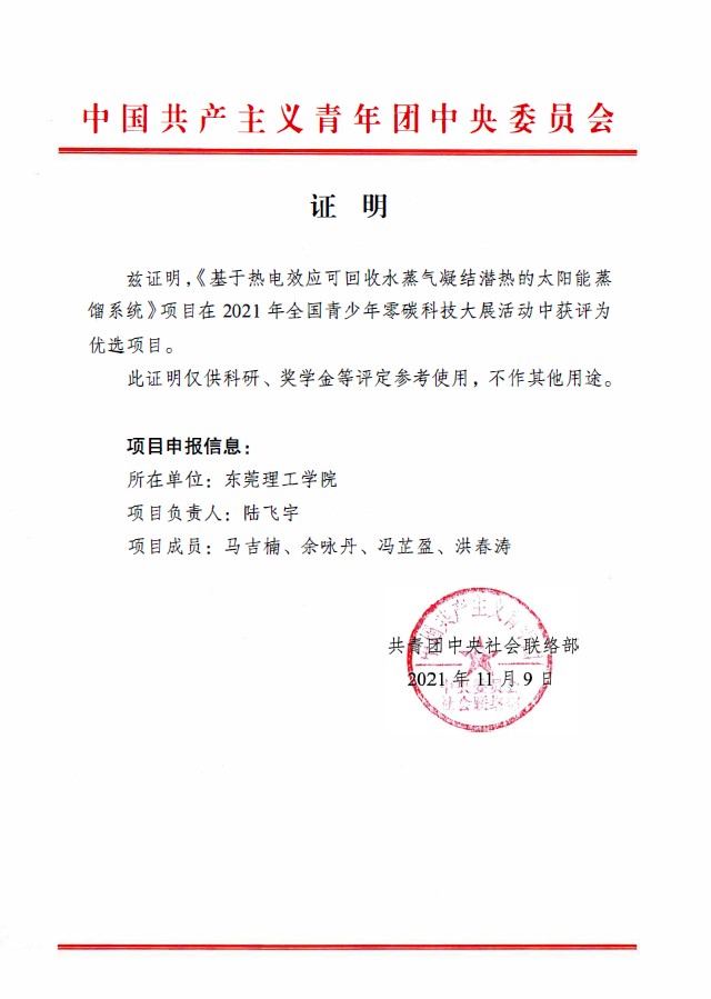 2021年11月,全国青少年零碳科技项目(创意)全国评审圆满结束。我院能源与动力工程专业学生的项目获评为优选项目,项目名称为““基于热电效应可回收水蒸气凝结潜热的太阳能蒸馏系统”,参赛成员包括陆飞宇、马吉楠、冯芷盈、余咏丹、洪春涛。