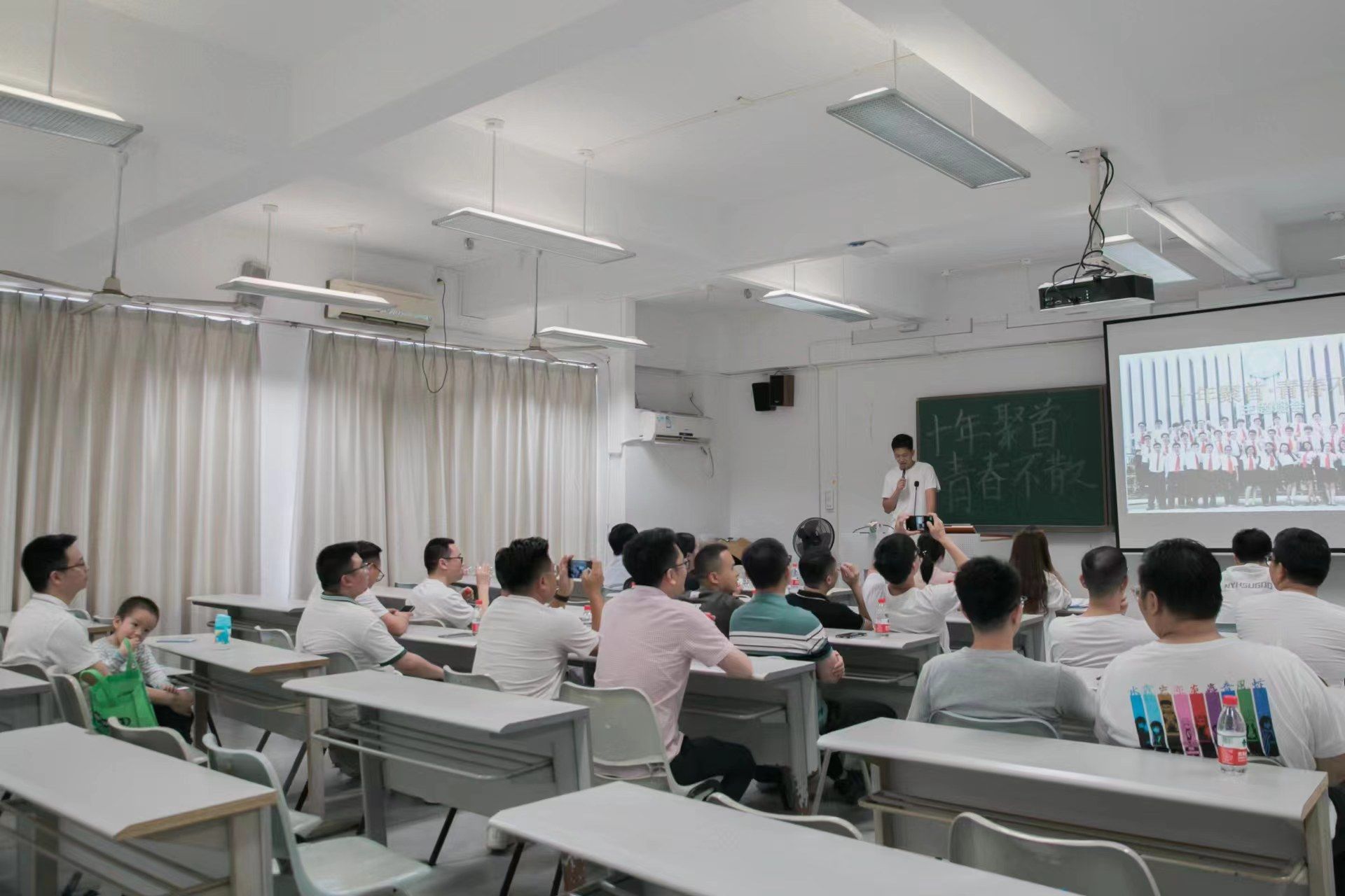 下午4时,校友们来到6栋教学楼楼下,在学院精心准备的签名墙上郑重写下对学院、对母校的深情厚谊,感激母校对校友返校的关心重视。随后,在6C405课室召开“十年聚首·青春不散”主题班会。班会首先播放了校友们大学4年的回忆短片,随后每位校友站在台上轮流发言,或诉说近十年心路历程、或谈谈工作生活近况、或畅谈未来打算,进一步交流思想、互相促进。最后,大家合唱一首《友共情》把活动气氛推向了高潮,高举班旗在教室里合影留念。2013届工艺2班校友毕业十周年返校活动在热烈而欢快的气氛中圆满结束。