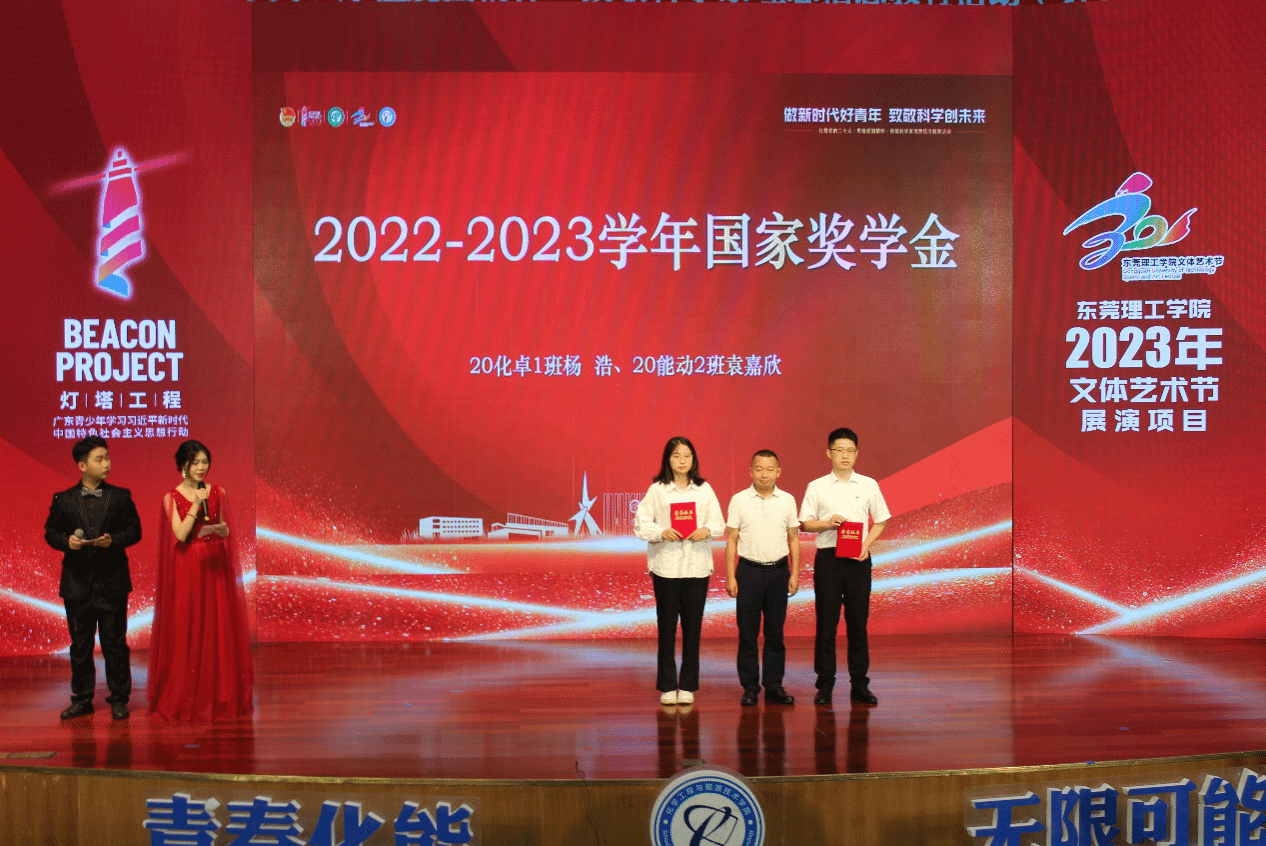 在颁奖仪式环节,分批表彰获得2022-2023学年国家奖学金、社会奖学金、校内一等奖学金的学生,化能学院党委书记尹辉斌,副院长黄斯珉、张刚、何运兵,党委副书记杨方以及受邀到场的企业嘉宾东莞市能源投资集团有限公司能源研究院常务副院长、东莞新锋光伏能源科技有限公司总经理李三军,东莞海丽控股集团有限公司总经理赵海红分别为获奖学生颁奖。荣获社会助学金和校内一等奖学金的22级化卓1班廖祥如同学表示,非常感谢学校和老师的培养,将继续努力、接续奋斗,与时代同行,争做有为青年,成为更优秀的自己!现场新生观众23级能动1班黄政豪同学看到台上受到表彰奖励学长学姐们,表示要向榜样学习,做新时代好青年,致敬科学创未来。