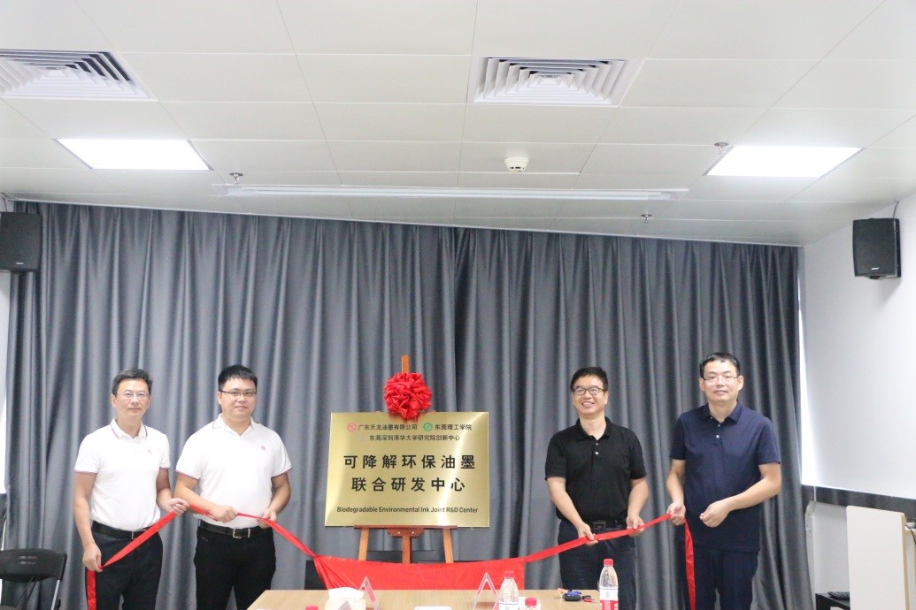 2021年8月20日上午,由广东天龙油墨有限公司、6776永利集团、清华东莞创新中心共同组建的“可降解环保油墨联合研发中心”揭牌仪式在东莞理工科技创新研究院举行。化能学院院长徐勇军,广东天龙油墨有限公司总经理蔡威、副总经理王纲,清华东莞创新中心副主任邬新国共同为可降解环保油墨联合研发中心揭牌。