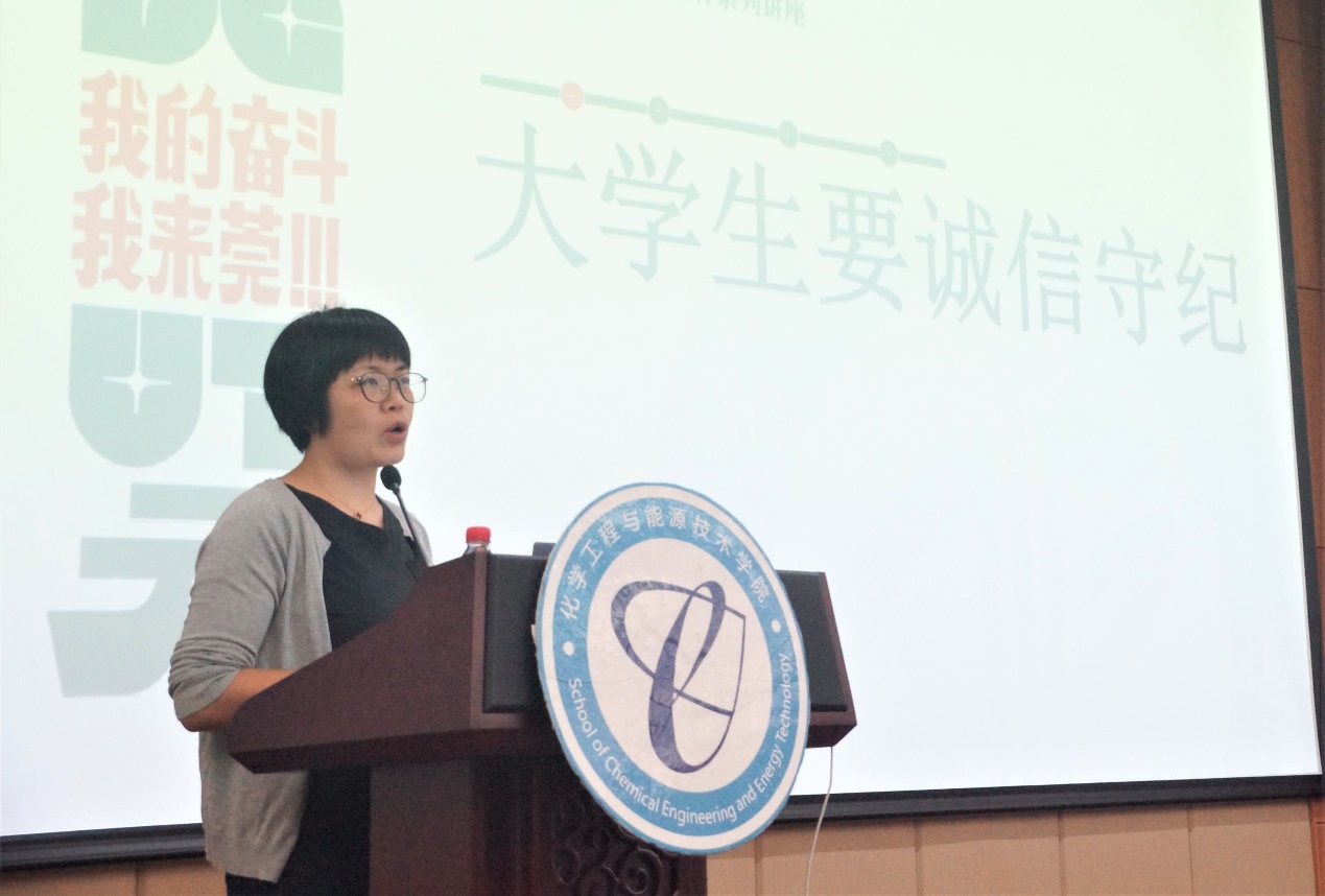 2020年10月21日晚,yl6776永利集团在学术会议中心报告厅举行新生教育系列讲座。学校党委学研工部副部长、学生处副处长柳卓君以《大学生要诚信守纪》为题,为化能学院2020级全体学生讲课。化能学院党委副书记李利平、辅导员涂叶满出席本次讲座。