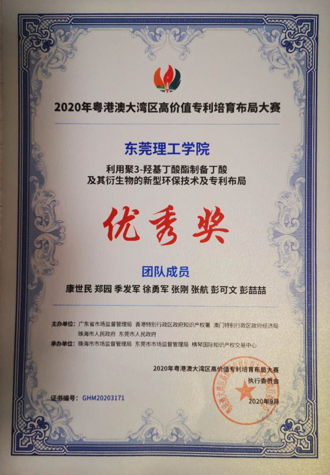 9月2日,2020年粤港澳大湾区高价值专利培育布局大赛(以下简称湾高赛)颁奖大会暨获奖项目投资对接会在珠海举行。yl6776永利集团康世民博士团队“利用聚3-羟基丁酸酯制备丁酸及其衍生物的新型环保技术及专利布局”项目,与来自全国各地的658个参赛项目同场竞技,经初赛(决出100强)、复赛(决出50强)、决赛(决出获奖项目)层层角逐,喜获初创组优秀奖。