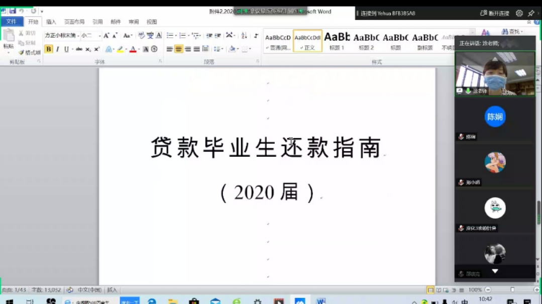 5月25日,化能学院在学生党建室12L102举行2020届毕业生诚信教育会议,会议形式分为线上直播与线下面对面交流两种。本次会议由化能学院政治辅导员涂叶满主持,目的是对2020届毕业生进行诚信教育与介绍国家助学贷款的还款流程及注意事项。21位申请了国家助学贷款的2020届毕业生分别通过线上直播平台和线下的形式参加了本次会议。
