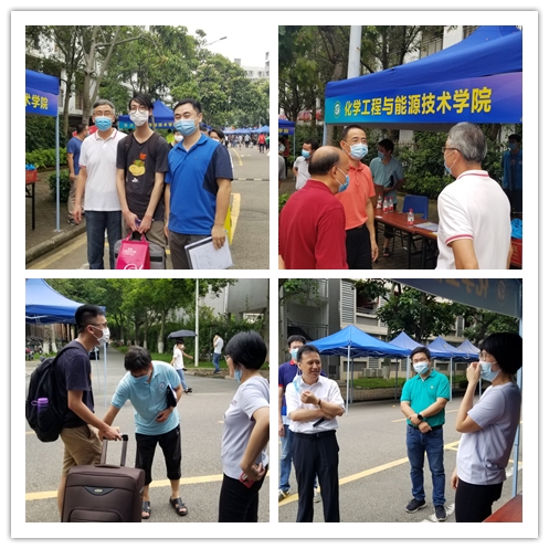 本次返校毕业生接待处分别为莞博社区门口,办公室,储物室三处,每处接待处都有教职工与志愿者负责接待并协助毕业生办理毕业事务。上午,马宏伟、吕琦元、杨敏林来到化能学院设于莞博社区门口的接待处,与化能学院部分教职工迎接返校学生,帮助学生搬运行李,同他们攀谈返校感想,并预祝化能师生返校成功。随后,返校毕业生到其他两个接待处上交健康卡与领取毕业纪念品。在整个过程中,师生情浓,同学之间互帮互助,温暖充斥校园之中。