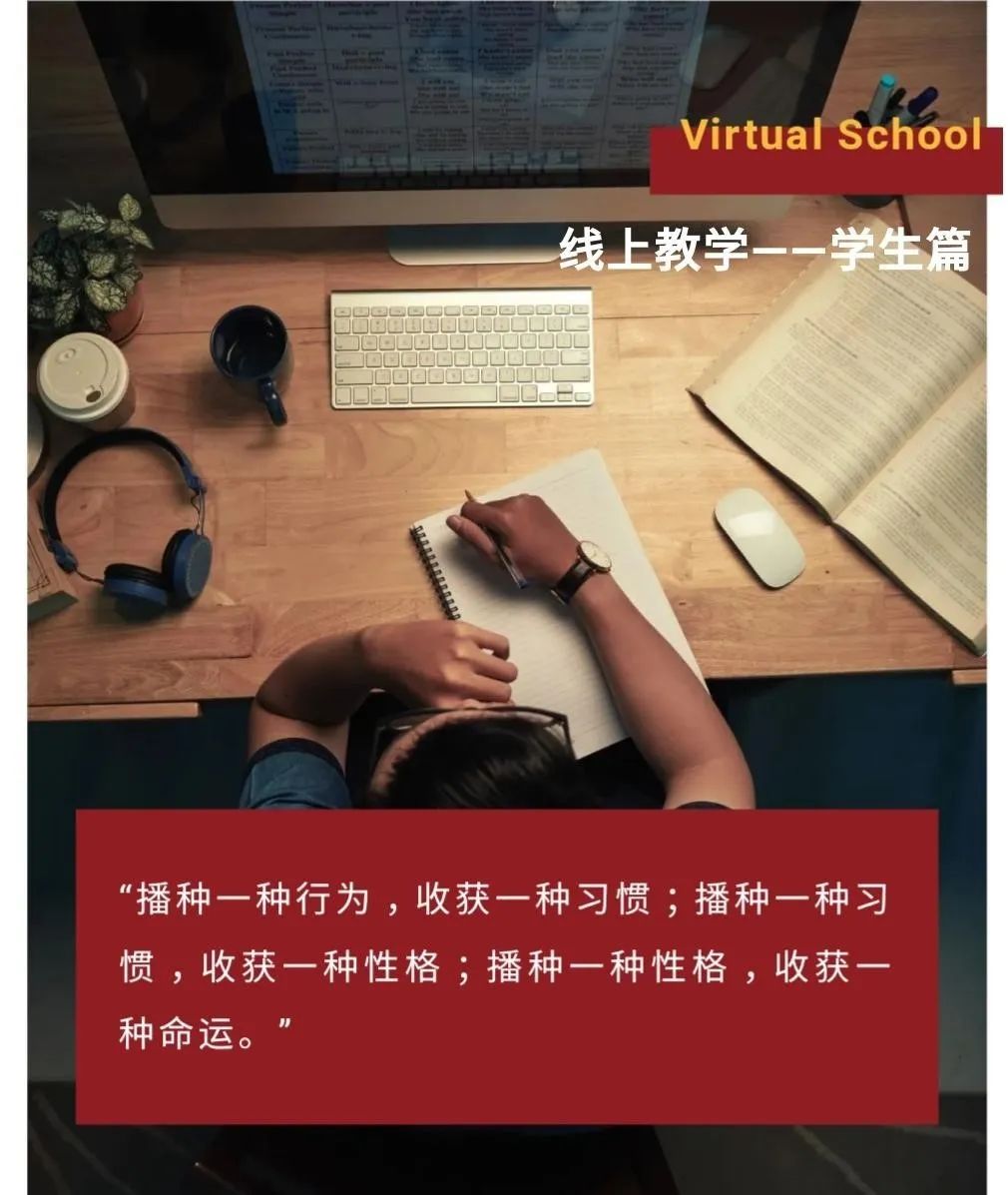 虽然我们知道在线远程教学并非最理想的状态,但是学校的全体教职工一直都在为学生能够在这段期间内得到最佳的教学而持续努力着。请各位在继续做好自我防护的同时,尽快投入到学习状态中,3月2日准时与老师们网络“见面”!线上学习其实并不陌生,但这场疫情带来的居家办公学习的隔离,使我们长时间独自面对电子产品及各种诱惑并不比学习知识本身简单。