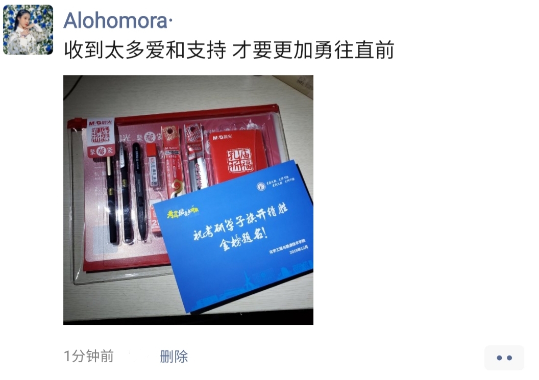 浓郁的考研氛围、身边榜样的激励、师生关切的祝福,大方实用的礼物……无不体现着化能学院对考研学子细致的关怀与殷切的期盼。收到学院的慰问,同学们纷纷表示定会牢记老师们的嘱托,竭尽全力进行考研的最后冲刺,不辜负学校对自己的栽培,不忘初心,不负韶华。
