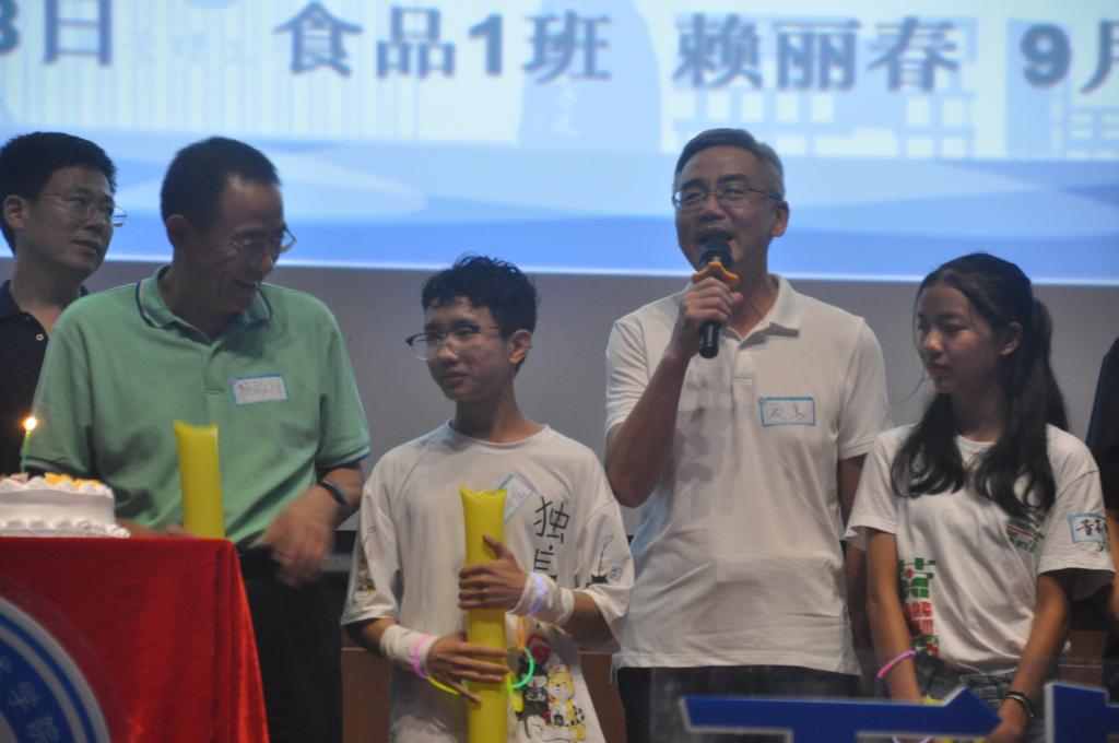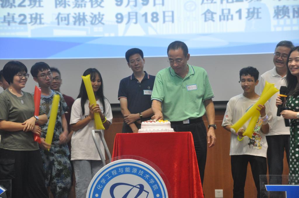 在政治辅导员刘哲分析完化能学院新生大数据后,20位9月份生日的萌新体验了一把不一样的生日。杨敏林、夏勇、徐勇军、尹辉斌、柳卓君等教师代表,一起为9月过生日的同学一起送上了生日蛋糕和心愿祝福。当萌新们吹灭蜡烛后,由副校长杨敏林为新生切蛋糕并送上寄语,希望化能学院学子在接下来的日子里学业进步,万事如意。