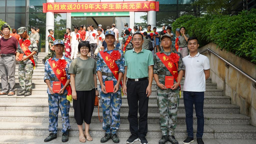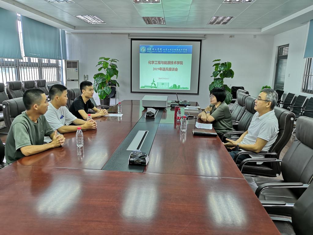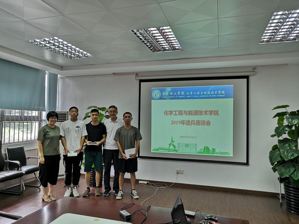 我校2019年夏秋季征兵工作开展以来,化能学院学生积极响应国家号召,报名入伍。9月10日,我校召开2019年欢送新兵座谈会。副校长杨敏林、宣传部、武装部、教务处、二级学院党委负责人、辅导员、新兵及其家长代表参加了会议。会后,副校长杨敏林与化能学院入伍学生代表合影留念。9月11日上午十点半,化能学院在会议室12L103举行2019年送兵座谈会。学院党总支书记夏勇、党总支副书记柳卓君、学工办负责人谢真葵,以及我院2018级应化3班胡岵等3名即将入伍的学生代表参加了座谈会。