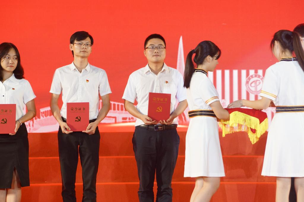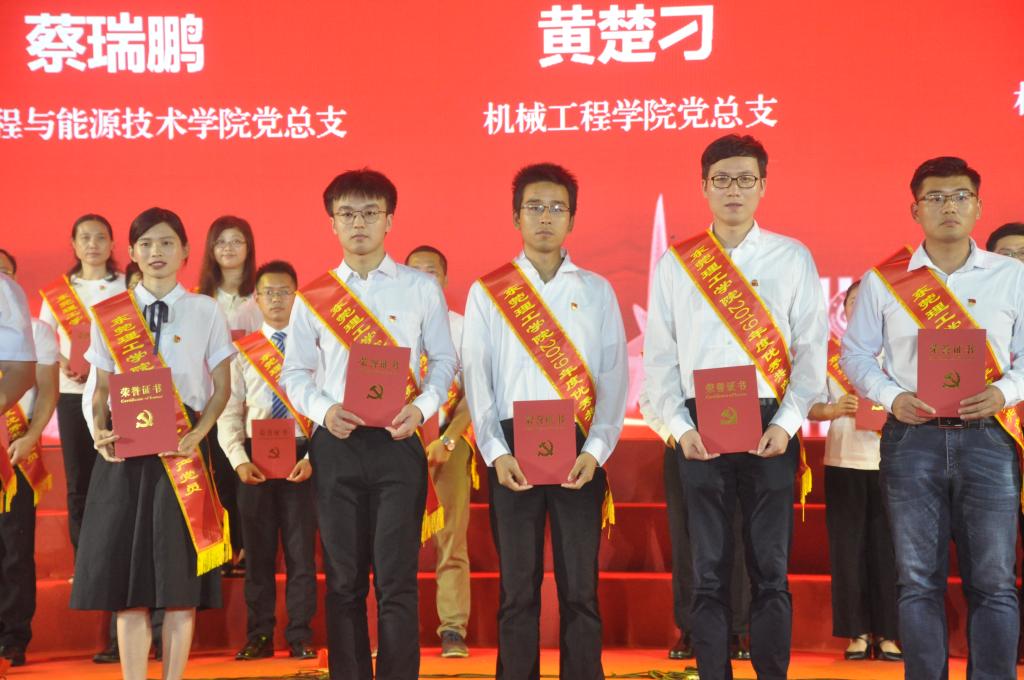 雄壮的国歌,拉开表彰活动序幕。本次活动共表彰了全校52名优秀党员、10位优秀党支部书记、10个优秀主题党日和10个优秀微党课视频,其中化能学院喜获多项表彰。校领导成洪波、马宏伟、赖日辉为获得者颁奖。获奖名单如下: