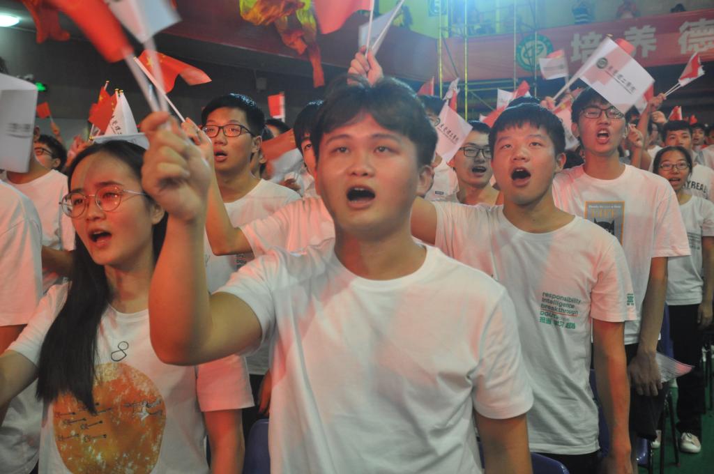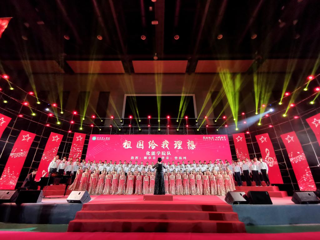 庄重的表彰仪式结束后,进入决赛的8支队伍逐一登台演唱红色经典歌曲。化能学院合唱队以一首《祖国给我理想》压轴登场,震撼全校。100余名师生组成的“硬核”队伍中,书记夏勇、院长徐勇军等学院党政领导班子全部带队登台。随着朗诵激昂的推进,台下全体化能学子起立,挥动着手中的小旗,欢呼阵阵。台上台下,交相呼应,共同喊出“以青春之我,创建青春之理想,青春之国家,青春之民族“的理想和决心,洪亮的口号震荡在每个人心中,滂湃的歌声响彻在校园上空。