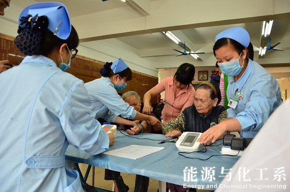 在分工之后,各位同学就去和老人们聊天,倾听他们的历史,并在聊天时,班级送上买好的水果并削给他们吃。同学们都很有孝心,不但耐心地听完老人们的故事,并且问了老人们现今的生活状况。在与老人聊天的同时,医生和护士们也在忙着为老人检查身体。测视力是最开心的一件事,护士和同学们都在为视力好的老人叫好,老人们都不甘示弱,都能赢得大家的掌声。聊天中,虽然有些老人因为岁数大听不见,但是他们看到同学们就开心。同学们表演唱歌和吹口琴,然后是全班合唱“万水千山总是情”,并向老人们献上之前在学校收集的祝福语,老人们都聊得很开心,院长也希望这样的志愿者再来。最后,12化工全班合影留念,告别老人们和院长。