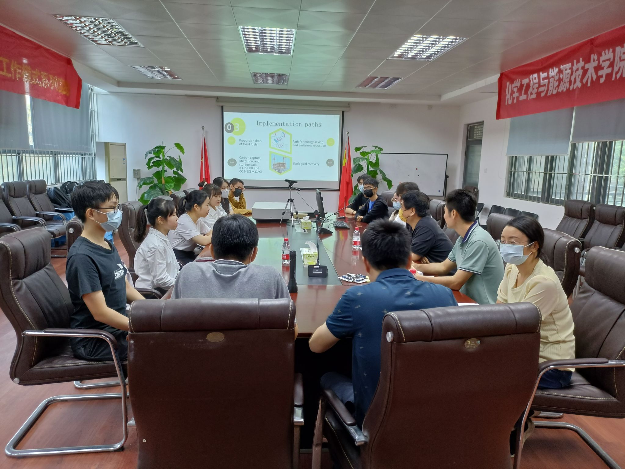 参与本次学术交流研讨会的学生呈现多元化,涵盖面广,包含了化能学院四个系不同专业和不同年级学生。赛前,参赛学生认真准备“碳达峰与碳中和”主题的全英文PPT。活动当天,交流研讨会采用全英文的模式进行,参赛学生逐一展示自己的设计。参赛学生的设计基于自身专业所学知识,查阅相关文献,并增加个人独到见解进行全英演讲。学生演讲完毕后,五位评委老师根据学生设计的PPT和汇报进行提问,师生现场互动轻松活跃,营造出浓厚的国际化交流氛围,更是有效提高学生的英语口语表达能力和上台演讲能力。