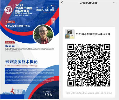 本届国际学术周,化能学院将开展一门国际课程,邀请英国帝国理工学院Duan Yu博士讲授“未来能源技术概论”,助教为何奎博士,计划采用线上线下结合的方式进行,以下是专家简介和国际课程的内容简介,以及国际课程的海报和预报名微信群,请感兴趣的同学提前加入微信群,向老师了解具体课程信息,包括授课时间、方式和内容等。
