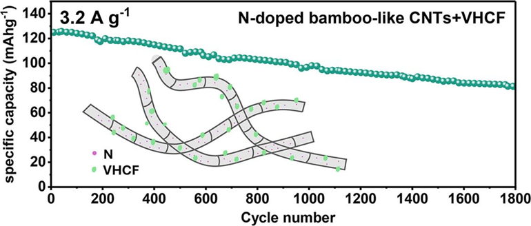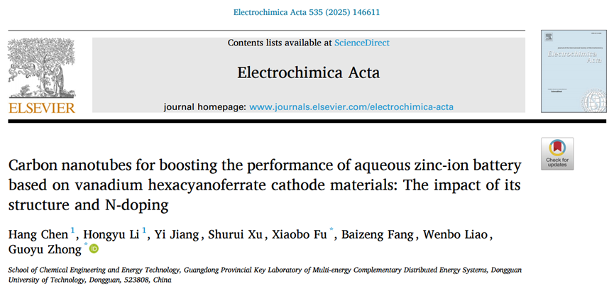 2023级能源动力硕士研究生李宏宇以共同第一作者在国际知名期刊《Electrochimica Acta》(中科院2区)上发表题为“Carbon nanotubes for boosting the performance of aqueous zinc-ion battery based on vanadium hexacyanoferrate cathode materials: The impact of its structure and N-doping ” 创新研究成果,陈航博士为共同第一作者,傅小波教授和钟国玉副教授为共同通讯作者,6776永利集团为第一完成单位。研究团队创新性地将铁氰化钒与不同结构的碳纳米管复合,探究了碳纳米管的氮掺杂特性与结构特征在提升铁氰化钒基水溶液锌离子电池性能中的关键作用。电池测试结果显示,引入碳纳米管可有效提升电极材料的比容量与循环稳定性。机理分析进一步表明,氮掺杂有助于增强充放电反应动力学过程,从而提高比容量;而竹节状与鱼骨状结构不仅能提供额外的机械支撑,也为Zn²⁺嵌入提供了更多活性位点,有利于提高电池比容量,同时延长循环使用寿命。该研究为开发柔性水系锌离子电池的碳基正极材料设计提供了重要的材料支持和理论依据。