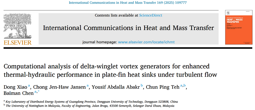 2023级能源动力硕士研究生肖东以第一作者在国际知名期刊《International Communications in Heat and Mass Transfer》(中科院2区)上发表题为“Computational analysis of delta-winglet vortex generators for enhanced thermal-hydraulic performance in plate-fin heat sinks under turbulent flow”的创新研究成果,陈佰满教授为通讯作者,6776永利集团为第一完成单位。研究团队创新性地建立了VG参数与热工性能的预测模型(Nu与f的RSM模型拟合度R²>95%),解决了多排VG在受限通道中的涡流干涉难题。该成果不仅为电子散热器设计提供量化依据,其涡流控制策略还可拓展至紧凑型热交换器与能源系统优化,推动绿色热管理技术发展。
